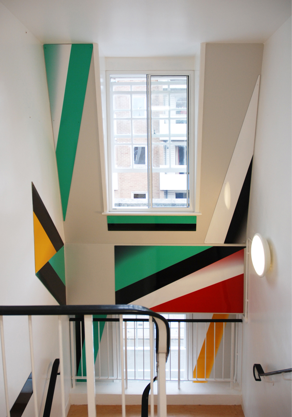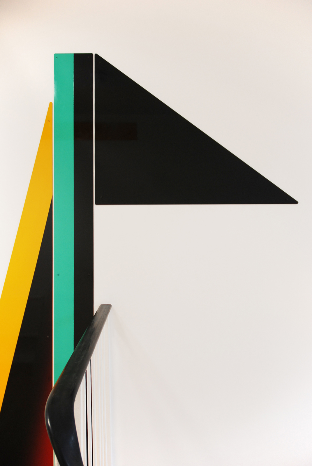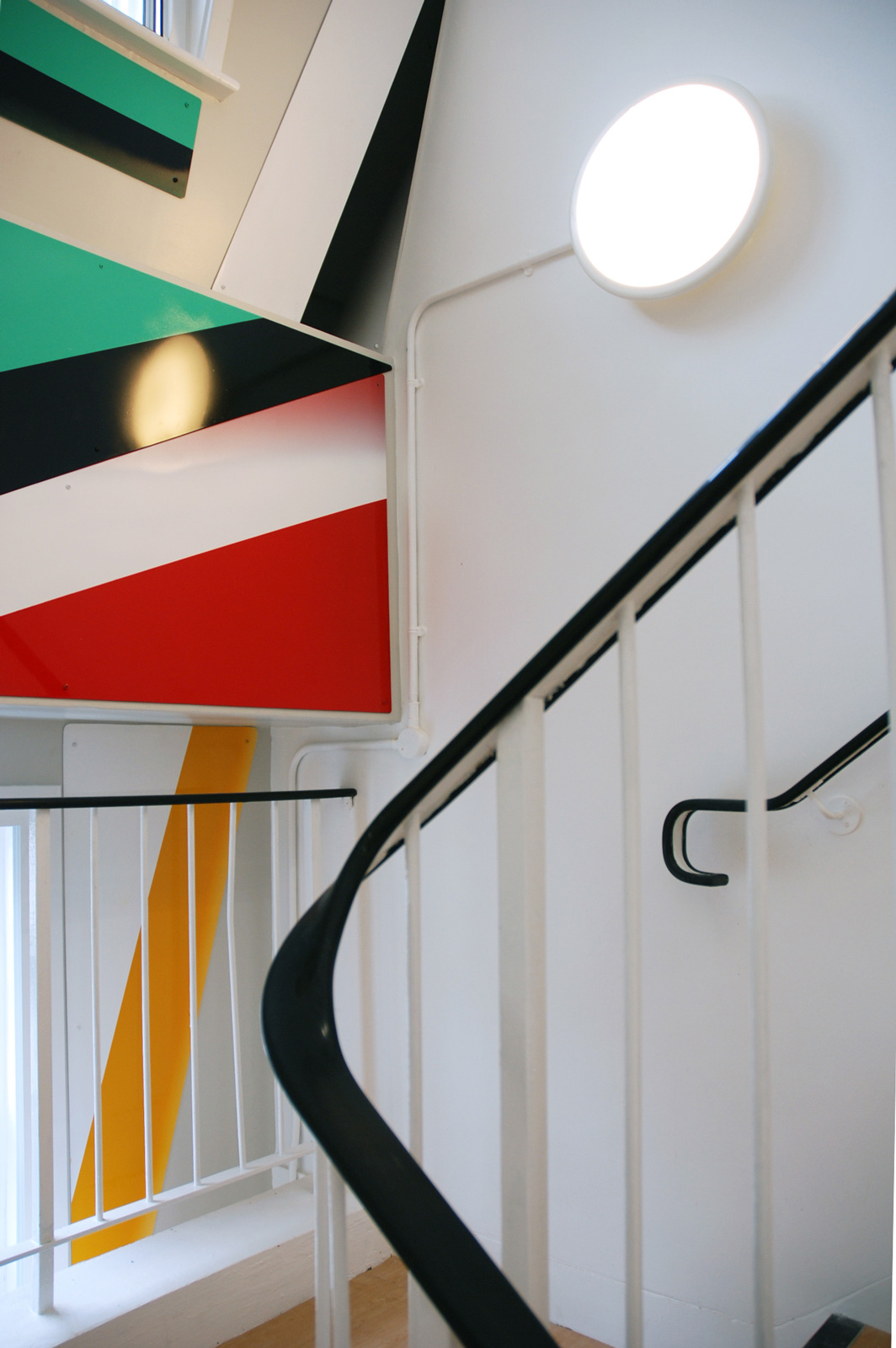In a three-floor high staircase of a Victorian house which has been converted into a small occupational health clinic, Gili used brightly coloured aluminium plates to connect the walls to the floors. It was Gili’s first work in London to use shaped metal sheets and epoxy car paint in an architectural setting.