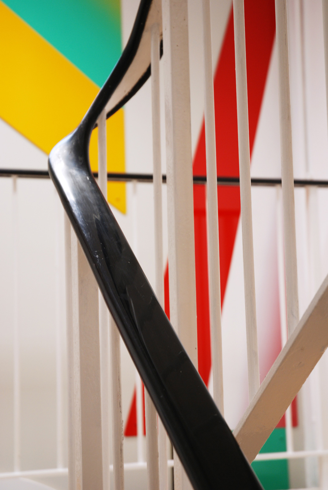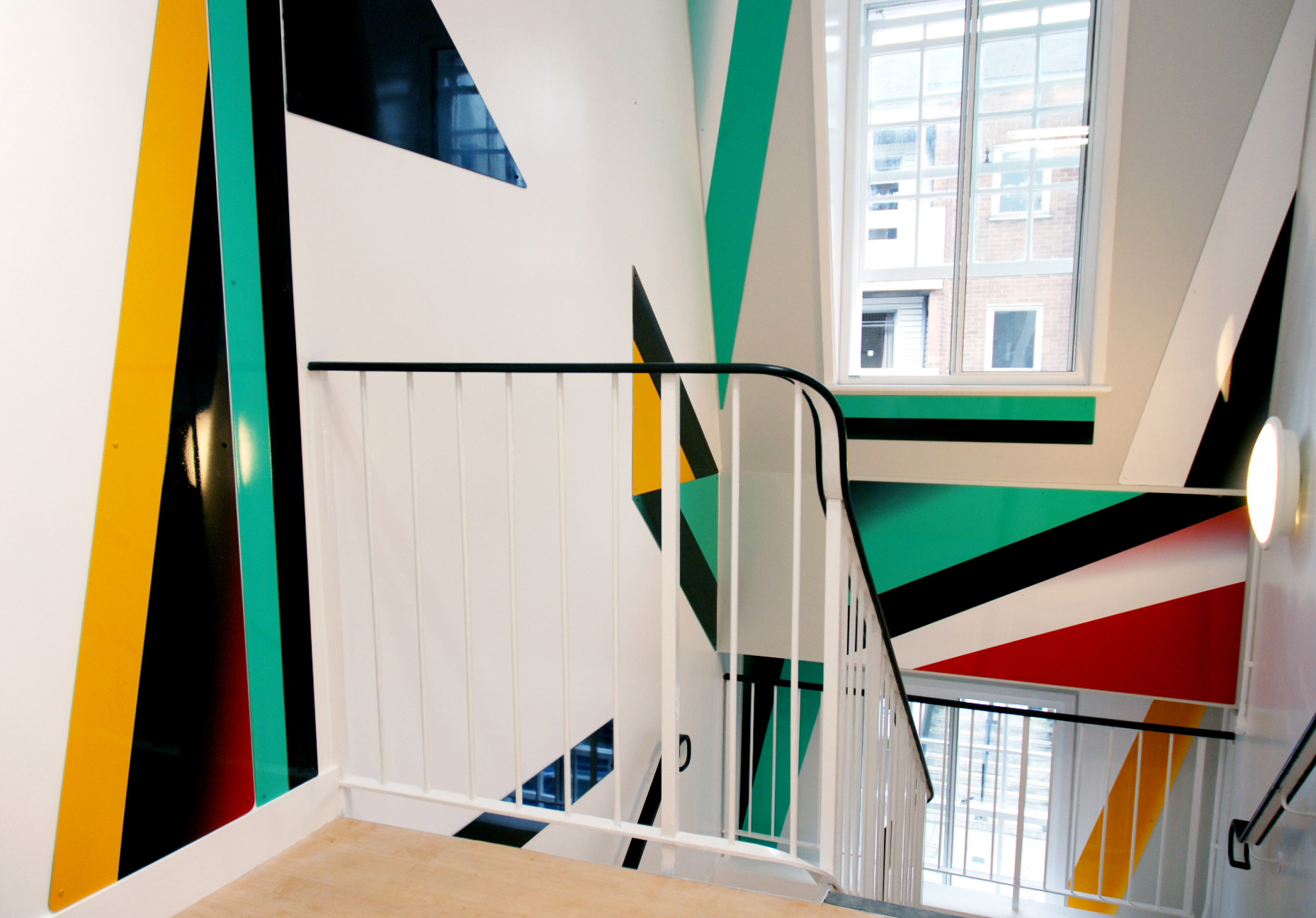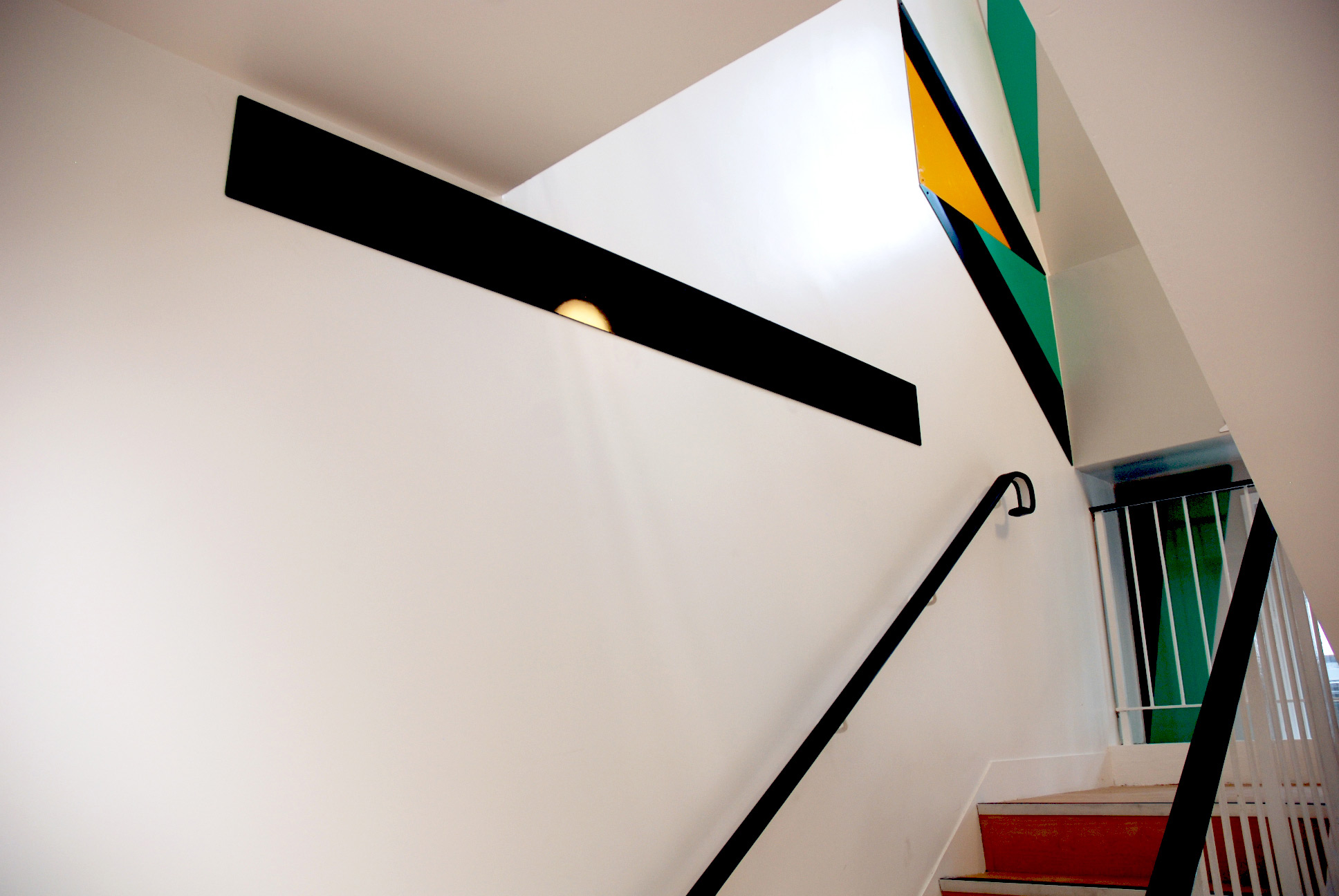 In a three-floor high staircase of a Victorian house which has been converted into a small occupational health clinic, Gili used brightly coloured aluminium plates to connect the walls to the floors. It was Gili’s first work in London to use shaped metal sheets and epoxy car paint in an architectural setting.
