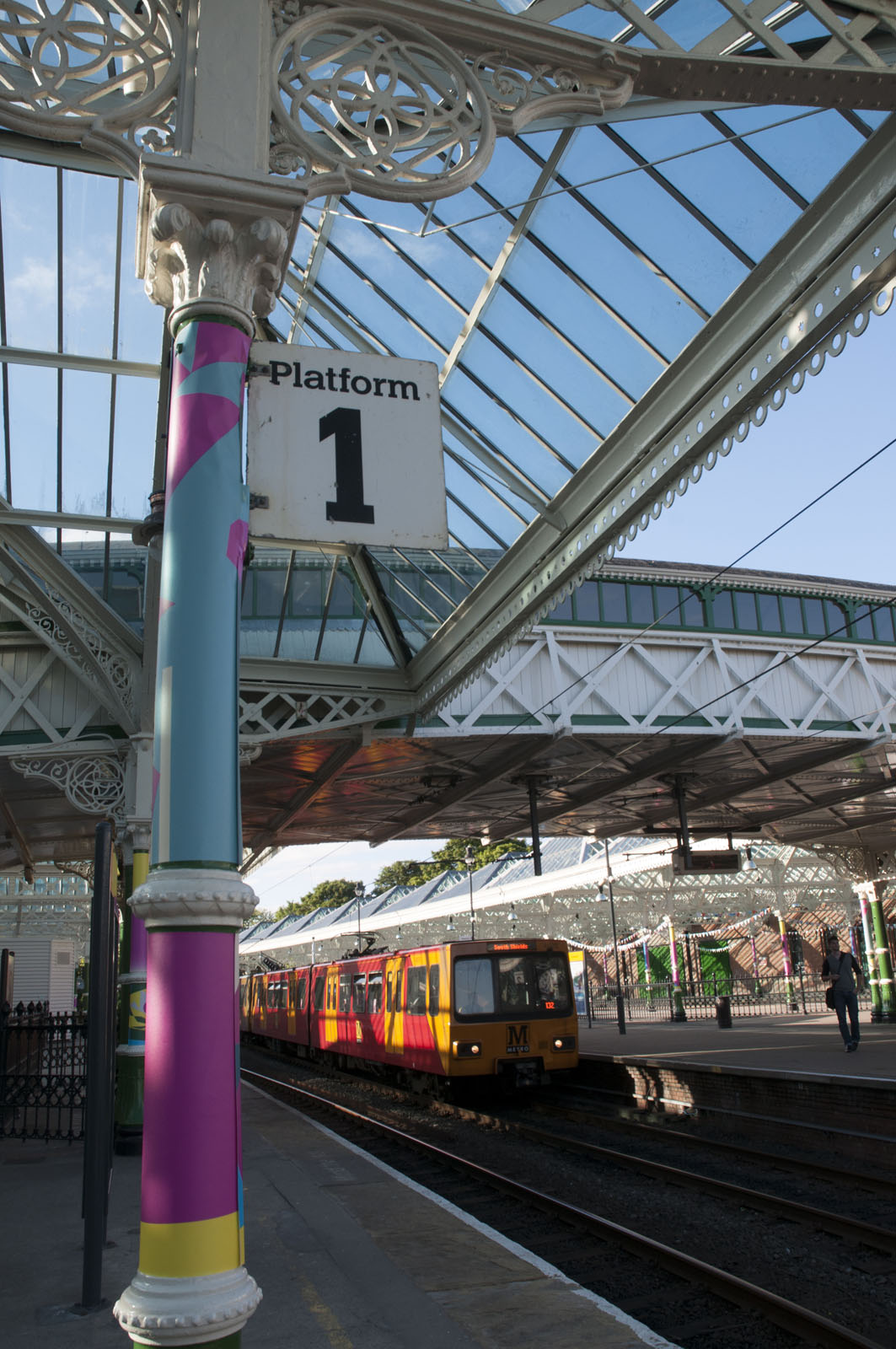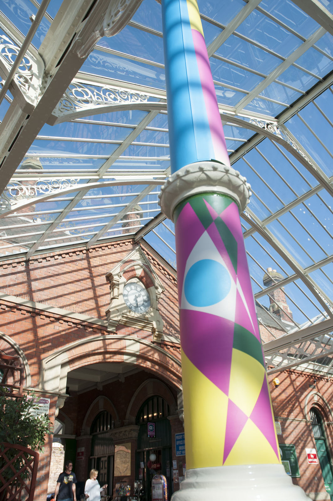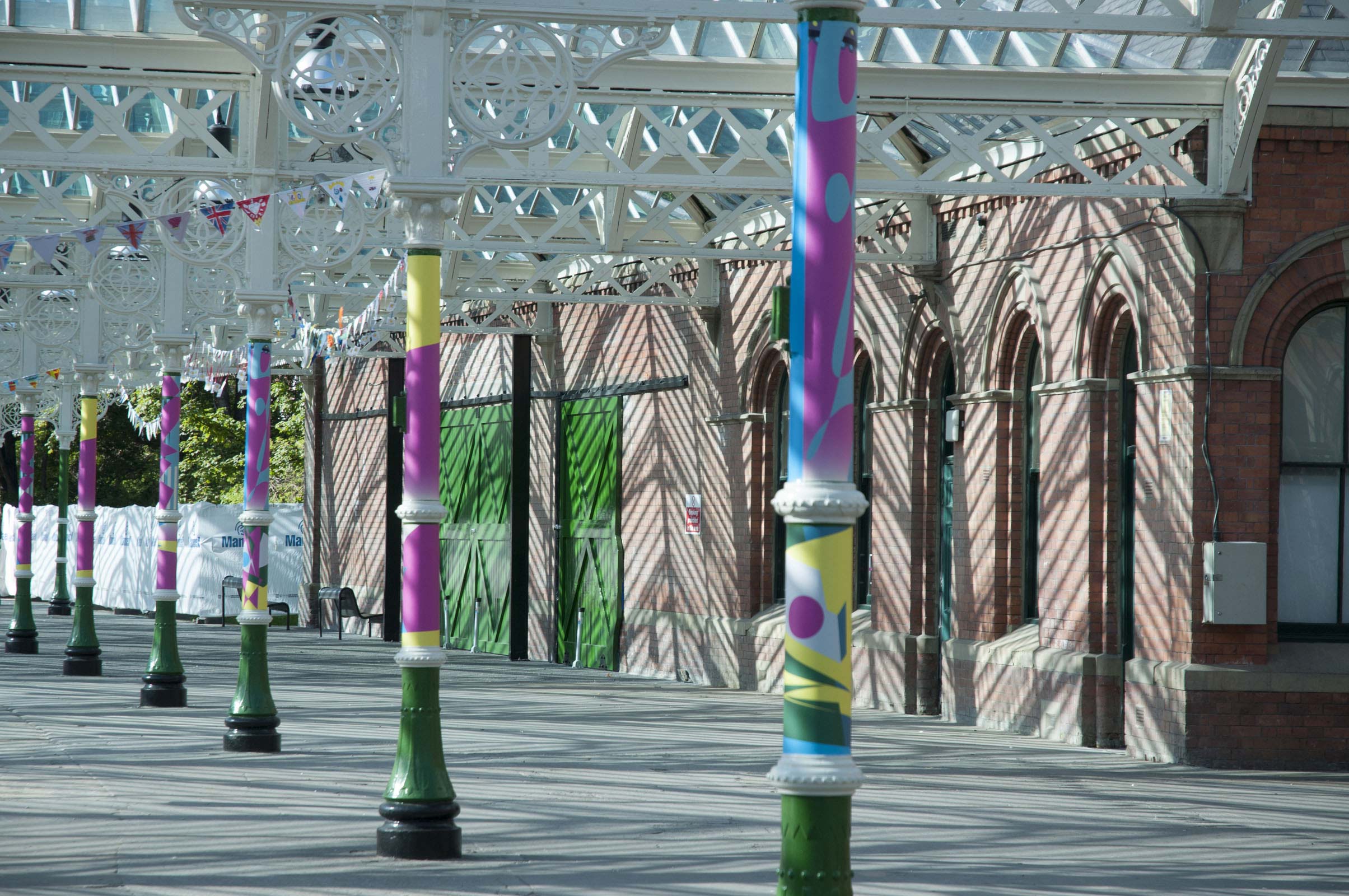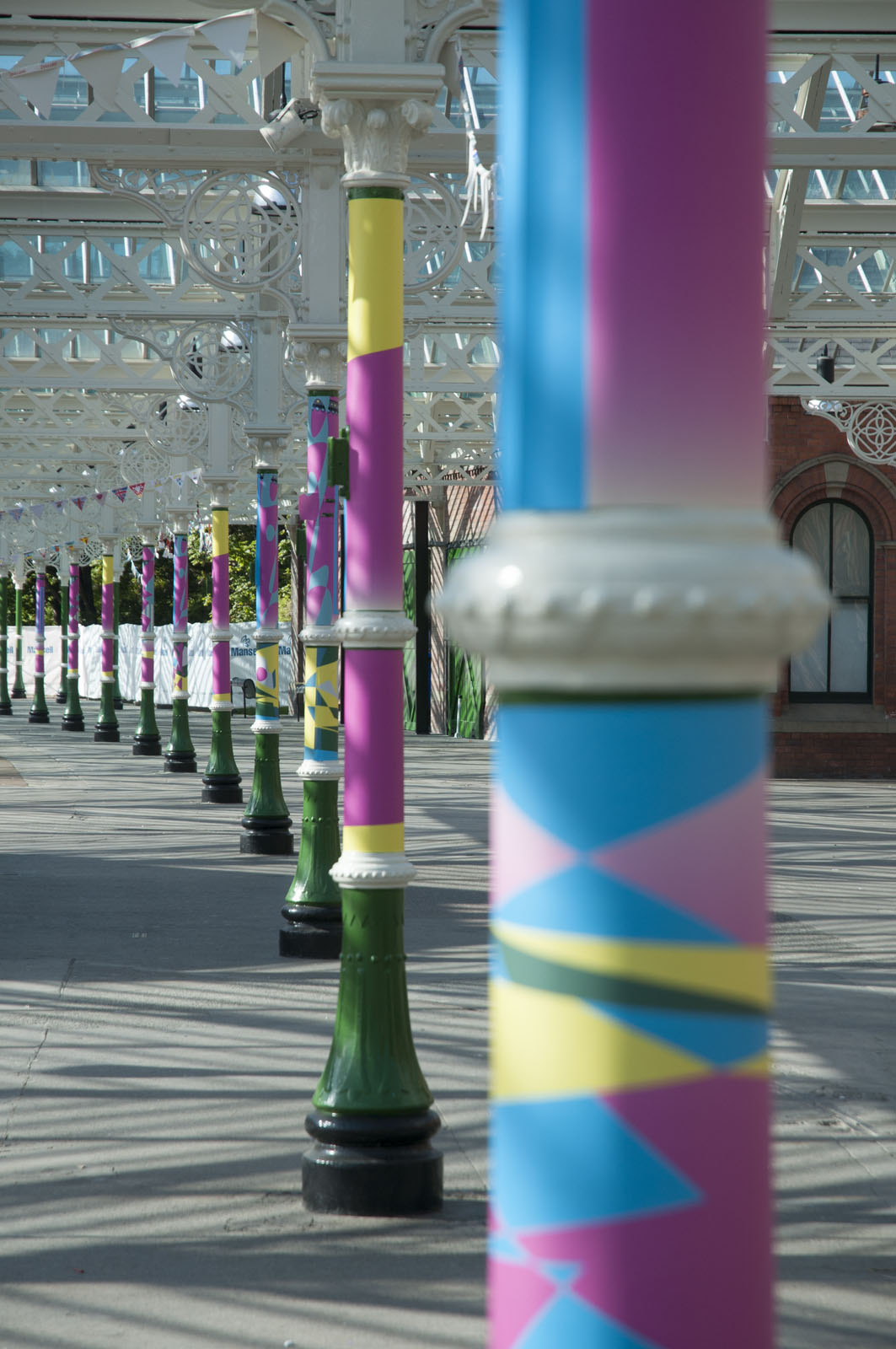 This work takes over an entire Victorian train station through the use of minimal elements, using the columns as the only surface, and colour and repetition as the tools.