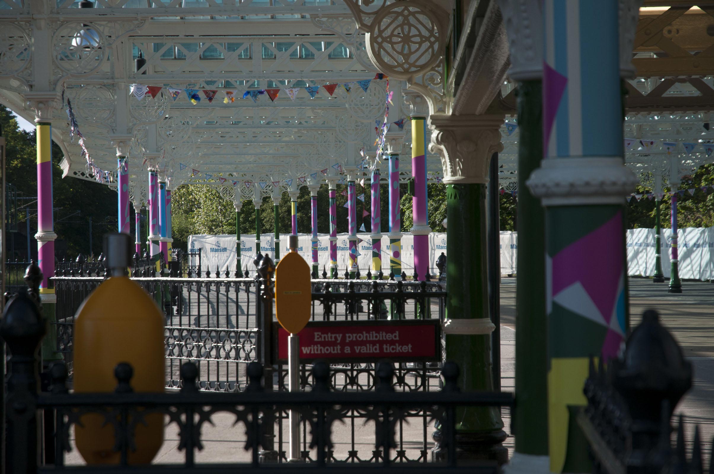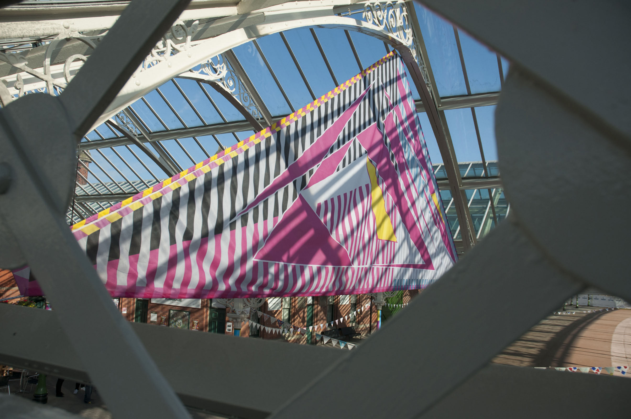 The station has changed little, and yet for me, similarly perhaps for those who first hung those plants, the necessity to add colour remains. Initially in the process my work took many different roads, but finally the idea of working with the columns won through. It is an essential structural element that can be taken for granted but, if highlighted, can become an interesting visual support. I worked on several combinations of posters for its different facets, considering various viewpoints plus the normal flow of pedestrian traffic on a daily basis as well as on special occasions. The final intervention, including the extra banners welcoming the visitors, aimed to be a celebration of architecture as much as an enhancer of social relationships, just like the flowers once were.”