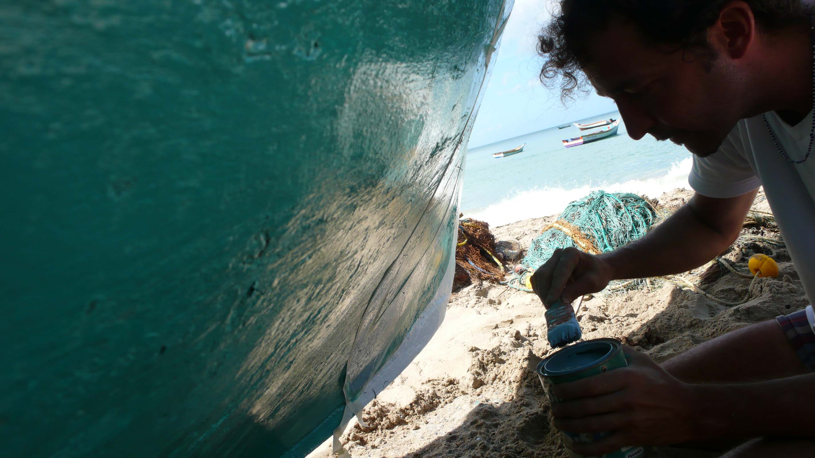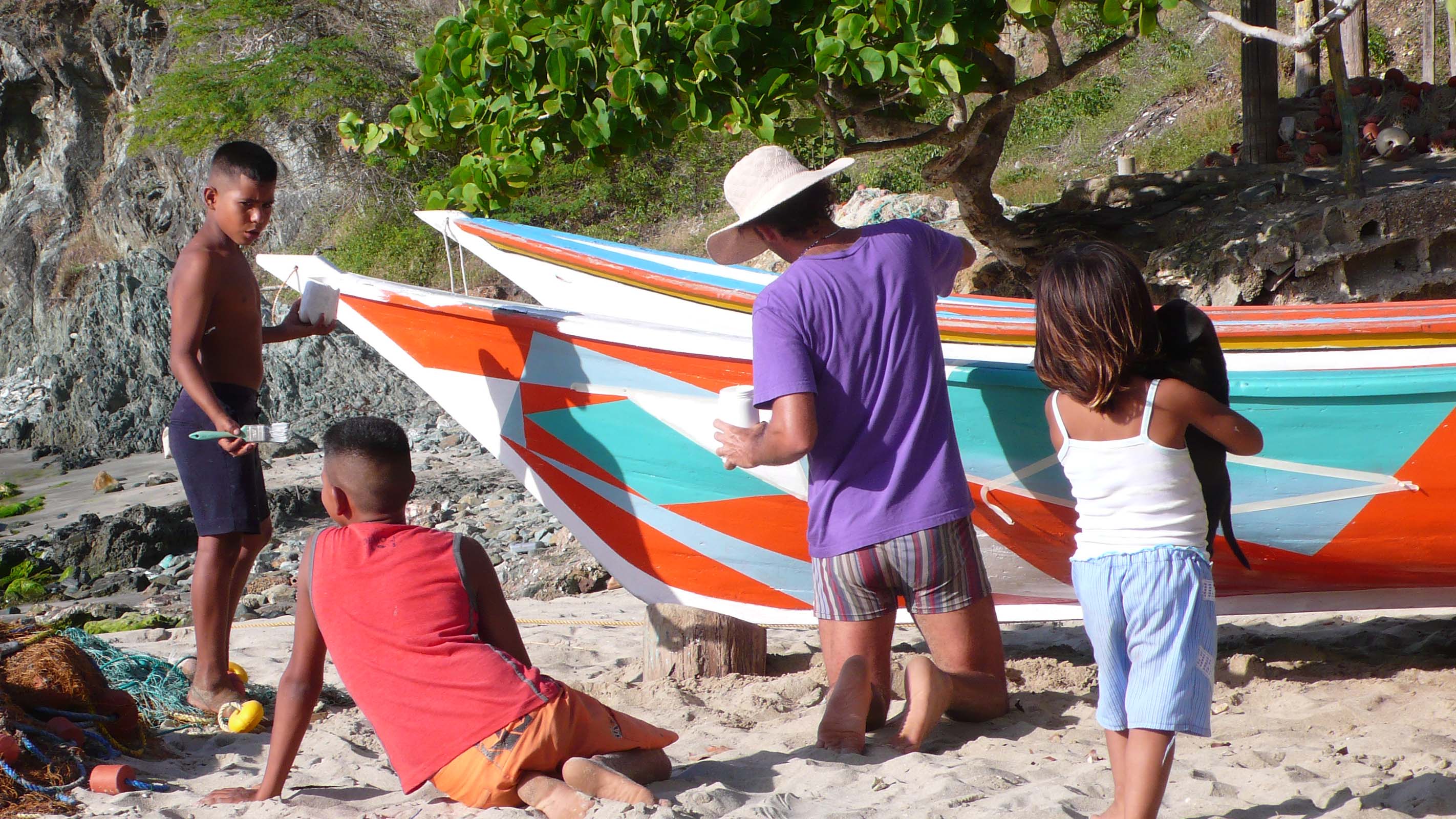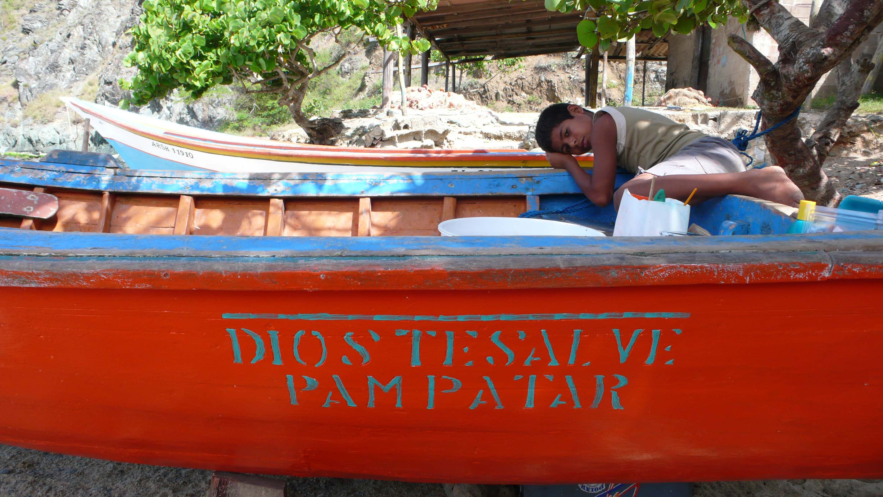 This project consists of a painting on the exterior of a boat owned by “Taco” Hernández, a local fisherman whose family Gili has known for a long time. The main idea was to plant a seed of possibilities in the minds of the local boat painters like the child who helped the artist on site. Perhaps one day the boats will be painted to speak a different language to that of straight parallel lines, and to have more playful designs like those on the buses in major Venezuelan cities.