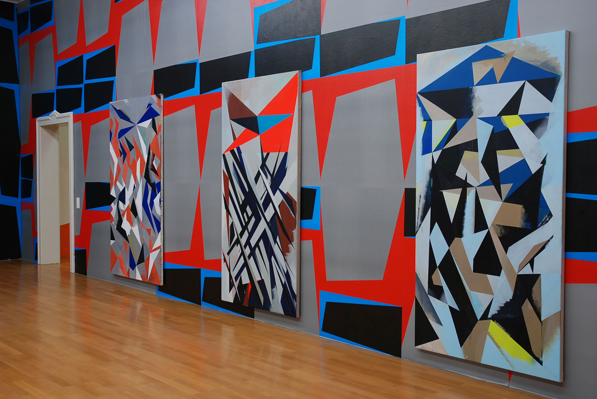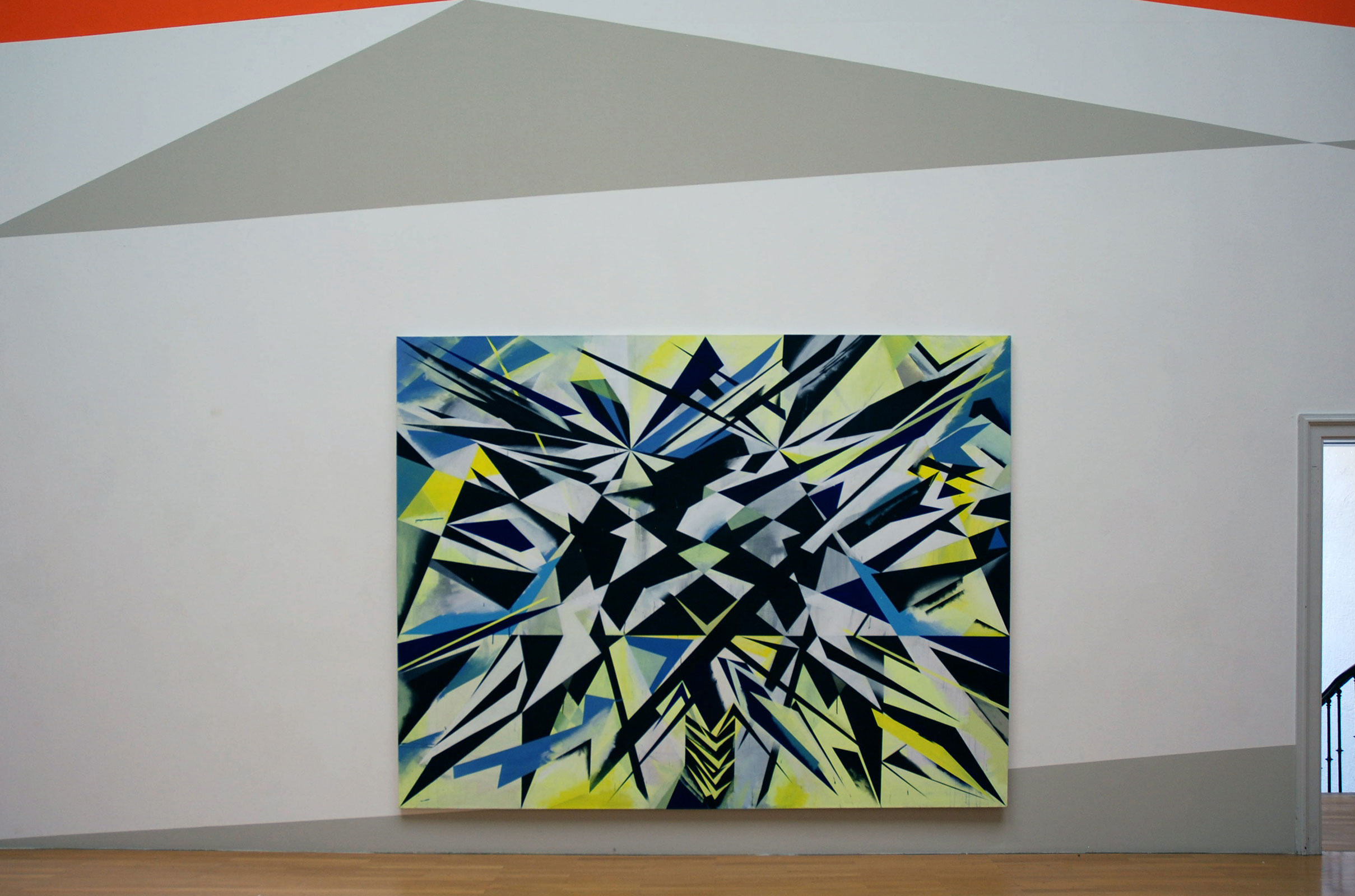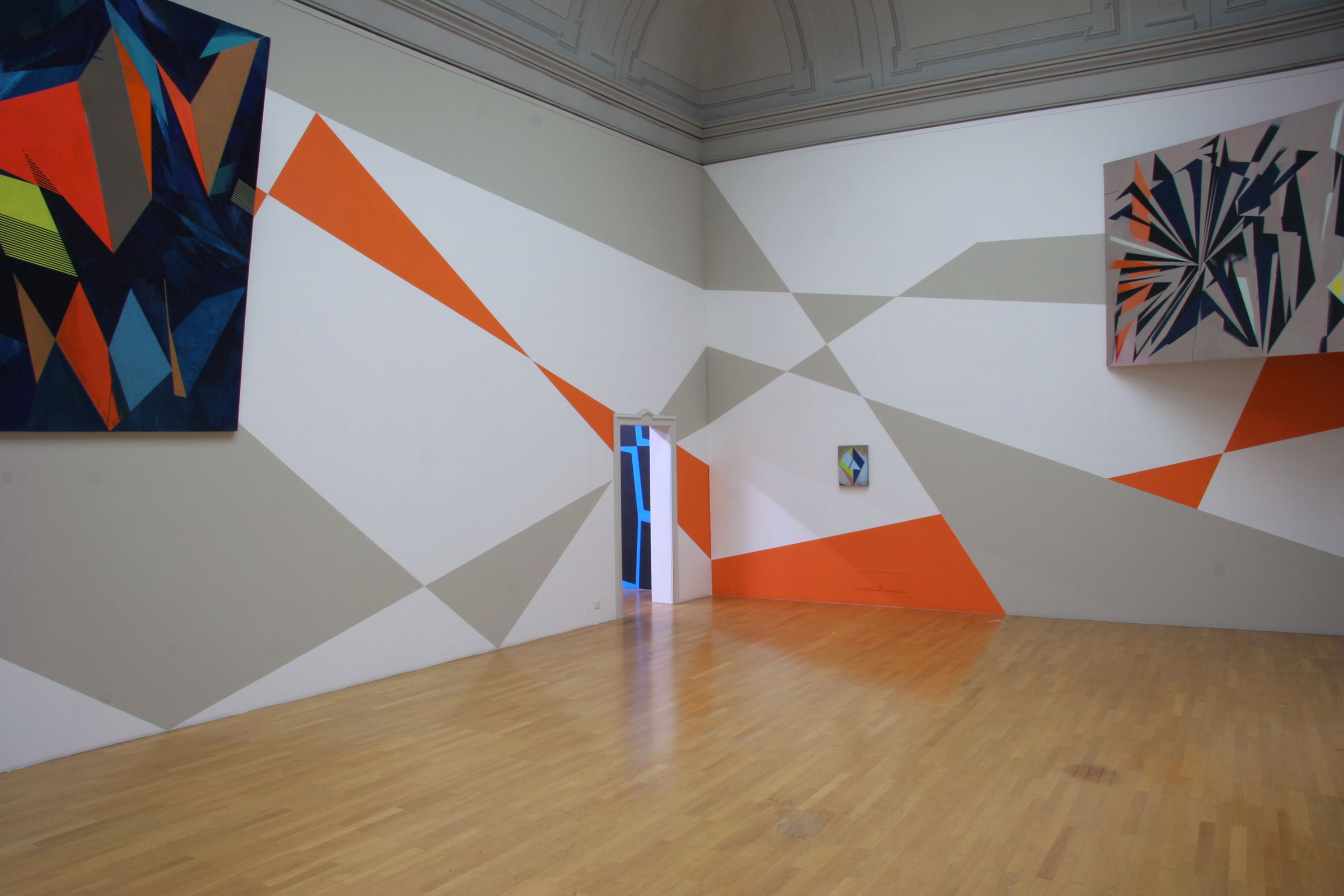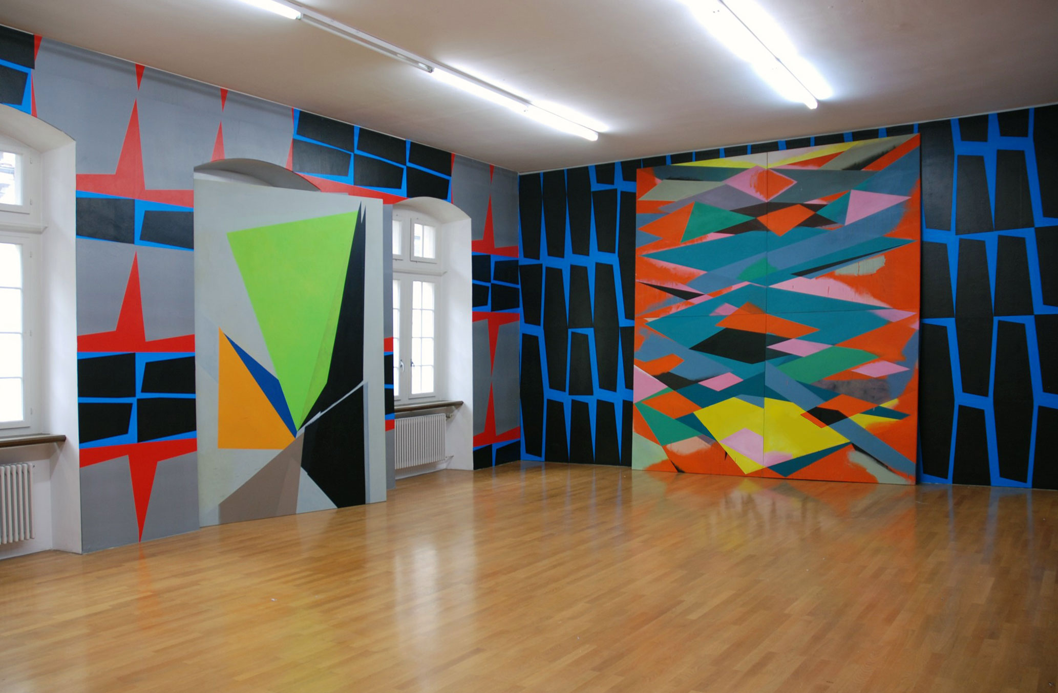 From the press release: “The wilderness of the jungle, providing living space for countless plants and animals, seems like the antithesis to Bill’s formalist and reductionist universe; for Gili, however, it is the tension that results from the combination of them both that makes him think about the possibility of an abstraction of the tropical jungle.Based on this idea of an abstract jungle, the installation turns into an artificial garden that is designed for viewing from specific viewpoints, very much in the tradition of the English garden. The large-scale paintings are integral parts within the thicket of artificially designed surroundings and wallpapers, but at the same time they stand out as solitary and autonomous objects.”
