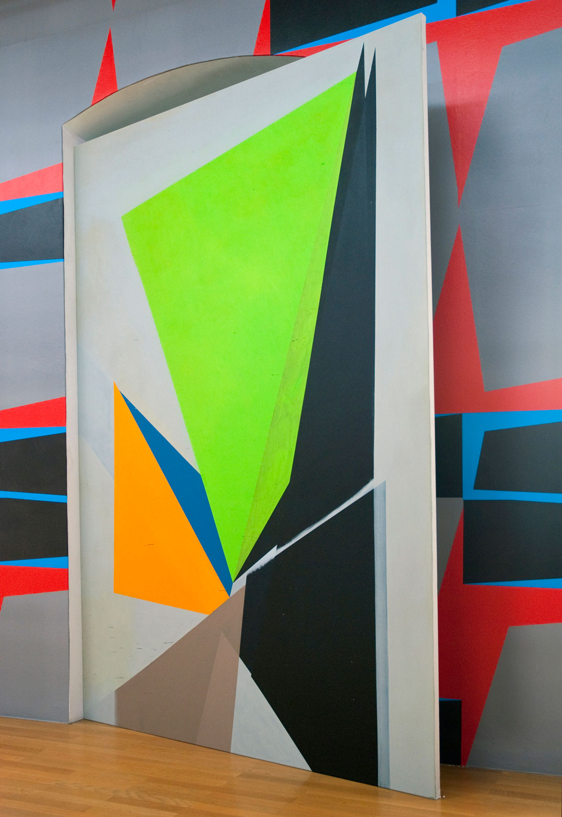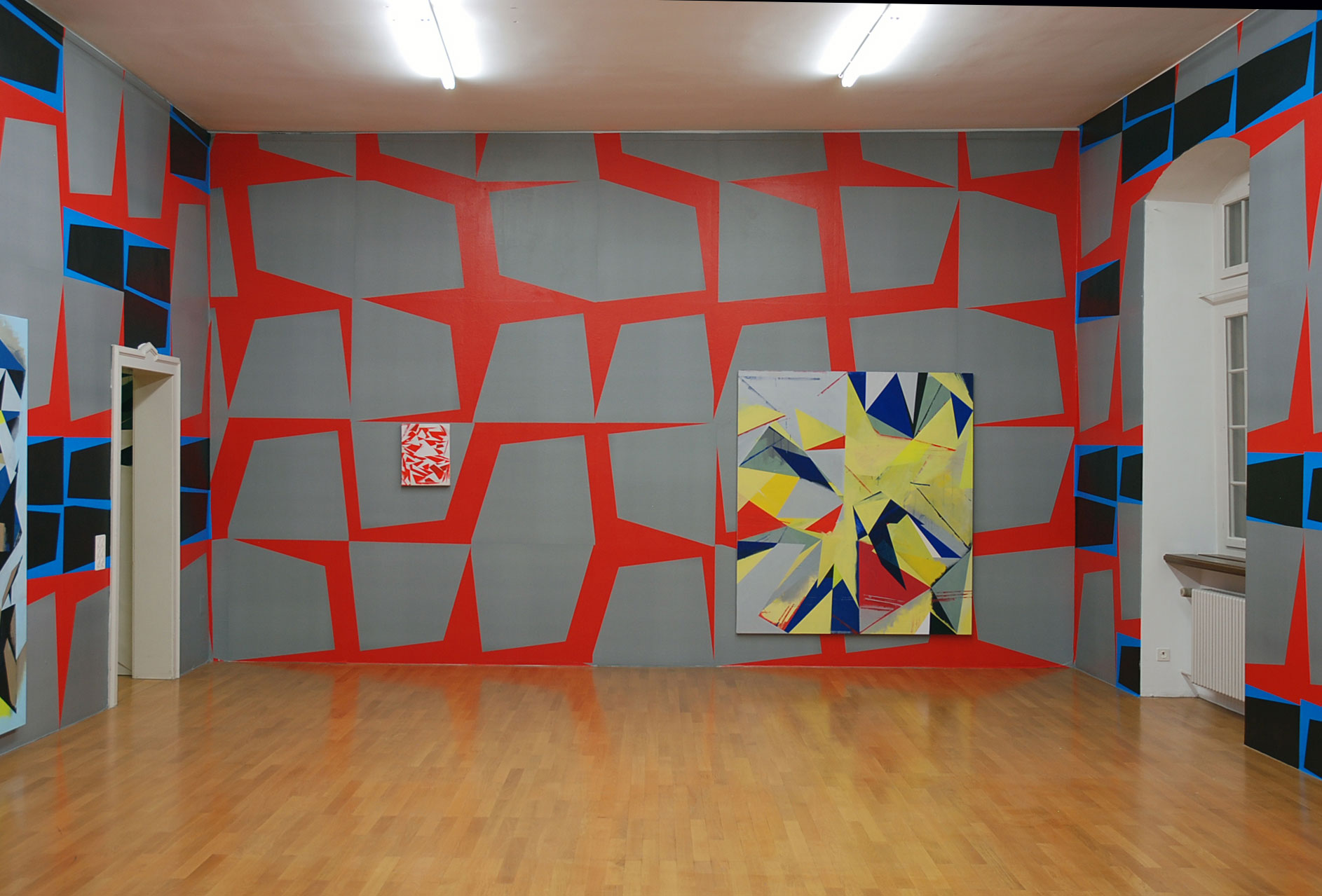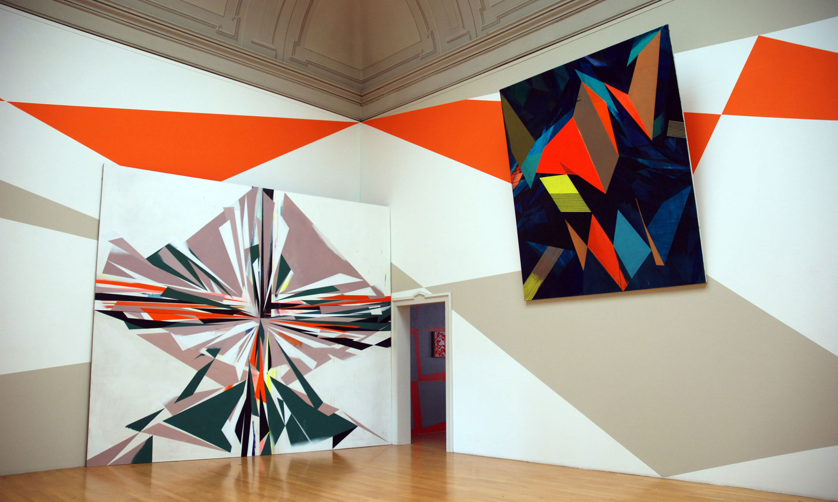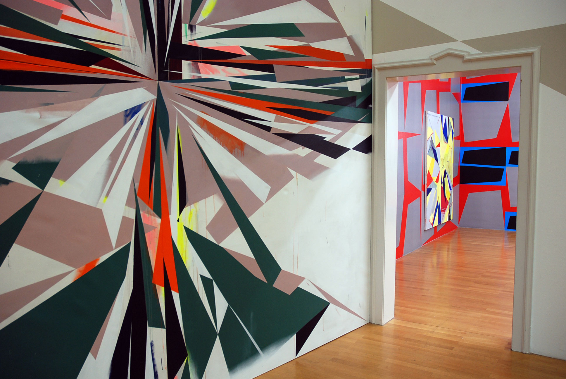 From the press release: “The wilderness of the jungle, providing living space for countless plants and animals, seems like the antithesis to Bill’s formalist and reductionist universe; for Gili, however, it is the tension that results from the combination of them both that makes him think about the possibility of an abstraction of the tropical jungle.Based on this idea of an abstract jungle, the installation turns into an artificial garden that is designed for viewing from specific viewpoints, very much in the tradition of the English garden. The large-scale paintings are integral parts within the thicket of artificially designed surroundings and wallpapers, but at the same time they stand out as solitary and autonomous objects.”