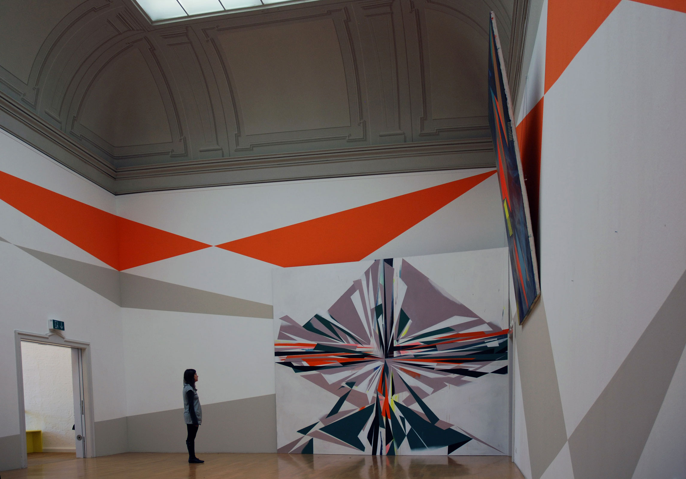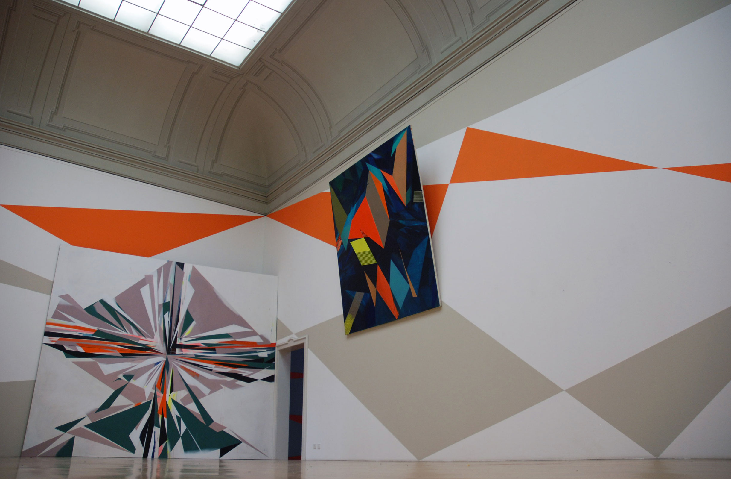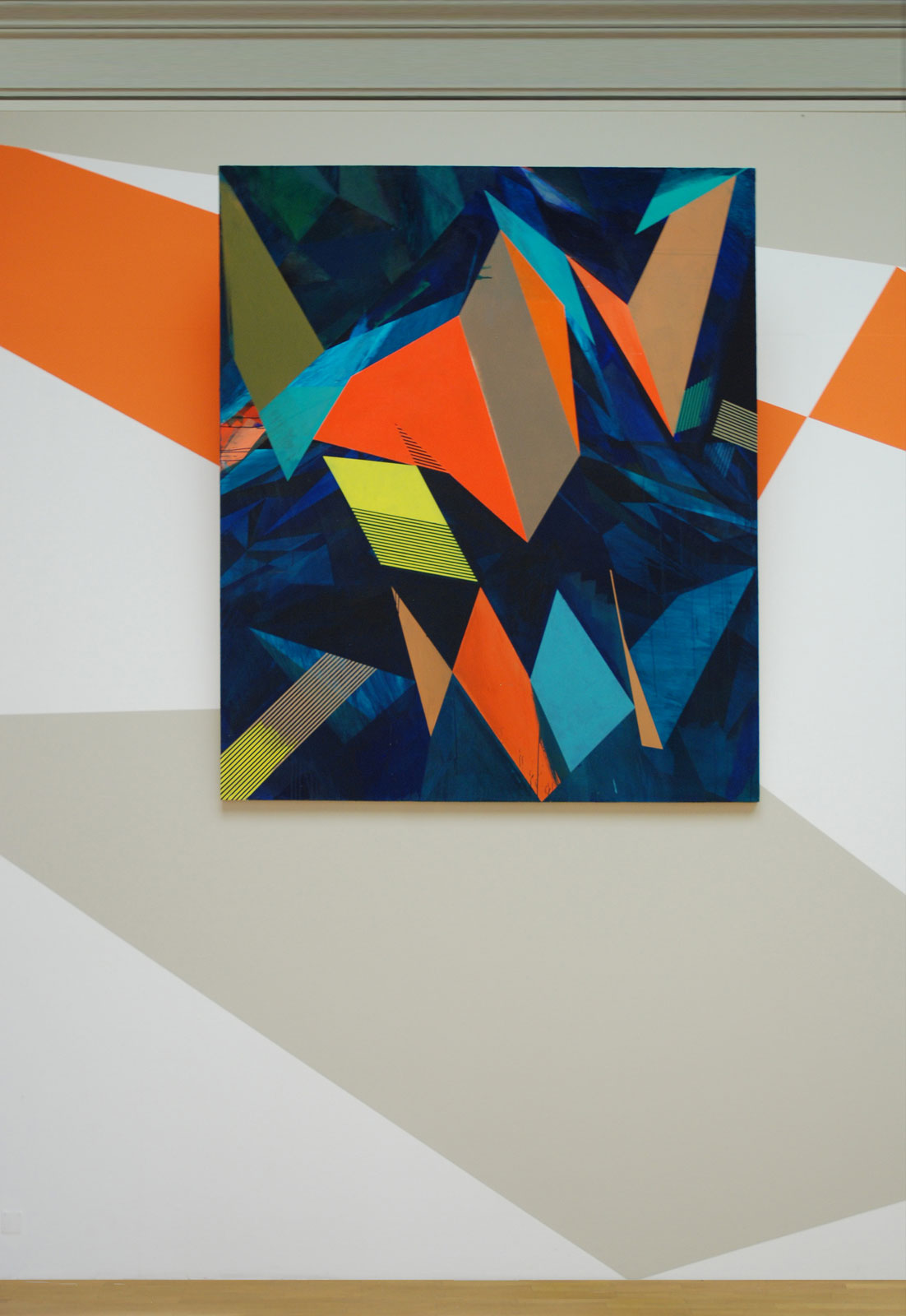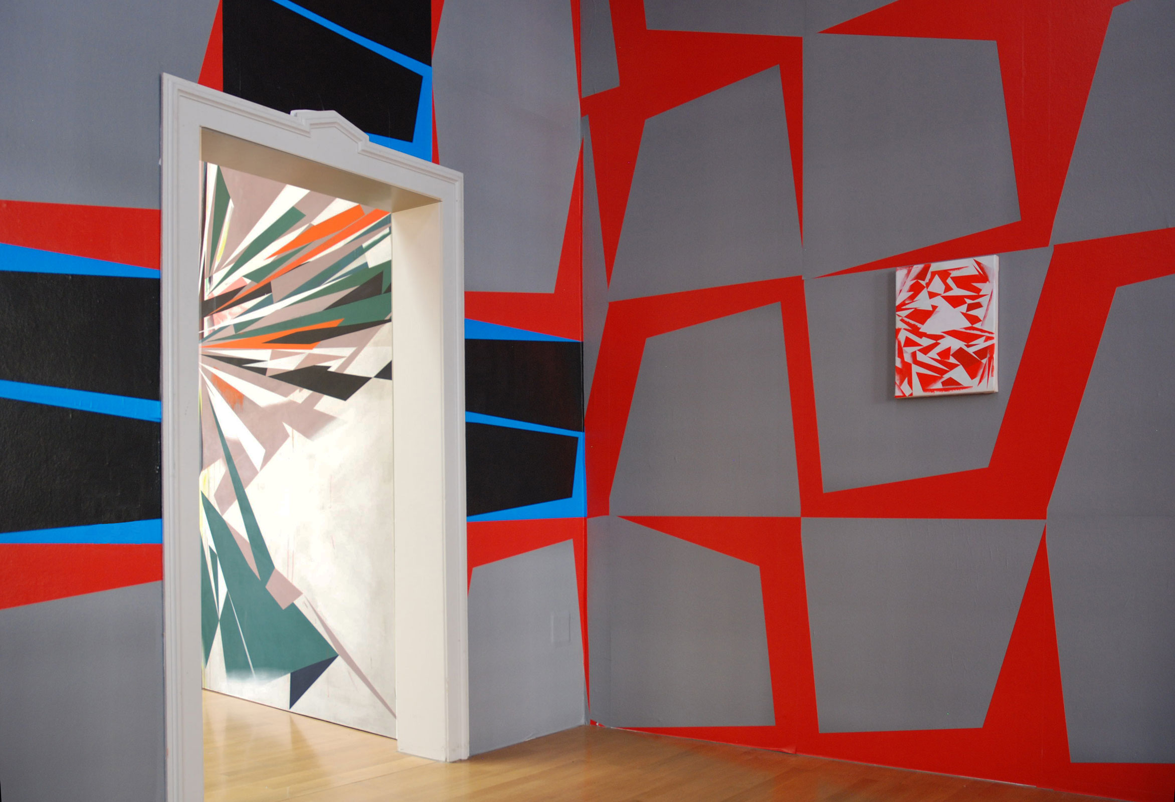 From the press release: “The wilderness of the jungle, providing living space for countless plants and animals, seems like the antithesis to Bill’s formalist and reductionist universe; for Gili, however, it is the tension that results from the combination of them both that makes him think about the possibility of an abstraction of the tropical jungle.Based on this idea of an abstract jungle, the installation turns into an artificial garden that is designed for viewing from specific viewpoints, very much in the tradition of the English garden. The large-scale paintings are integral parts within the thicket of artificially designed surroundings and wallpapers, but at the same time they stand out as solitary and autonomous objects.”