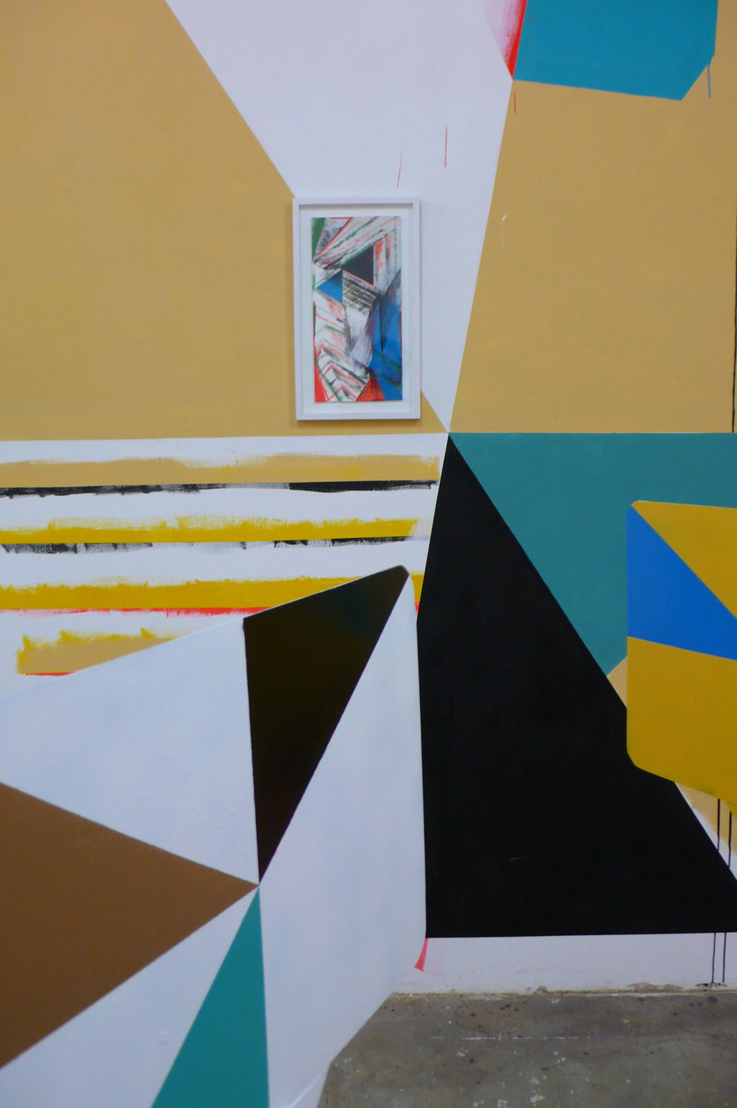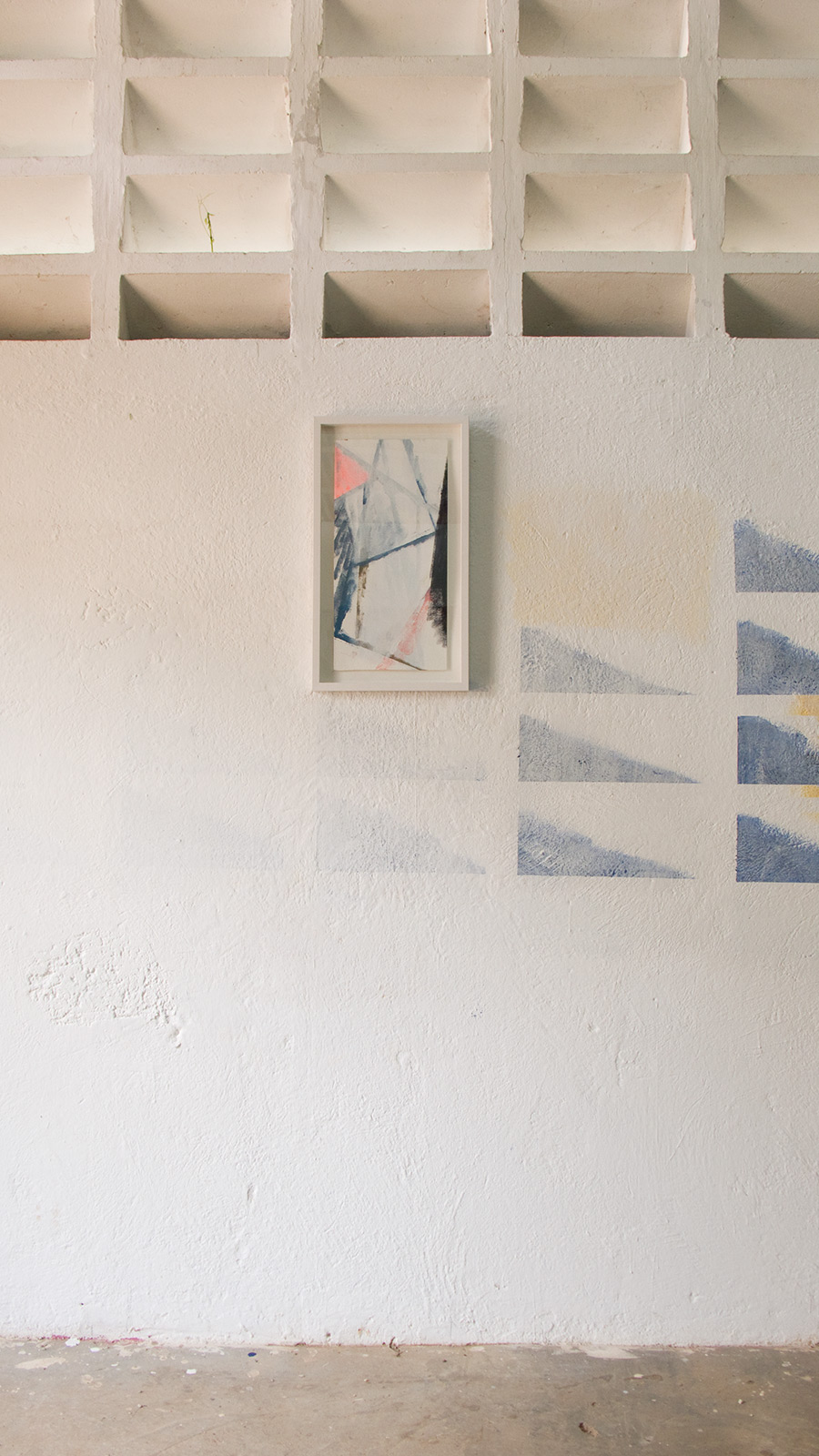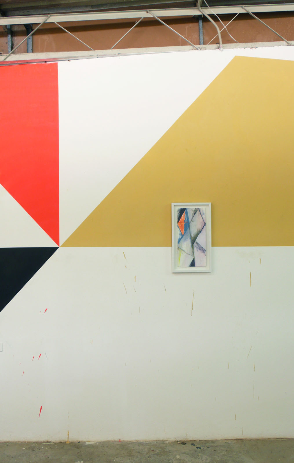 The mural, created specifically for this show in Oficina#1, acts as a map on which the rest of the works appear. Several of these works from the CODA series on paper, as well as a small painting on display, become amplified details of non-descript areas of the city. With this, Gili makes an analogy between the average speed of displacement in the city, a movement ultimately dogged by slowness, which ideally would be matched by the speed at which the viewer should appreciate the works. Rhythm, chaos and repetition mark the pace in the paintings and the mural itself. Gili relates this cartographic vision with the early appearance of aerial views in painting and the connections with abstract painting, as seen in the work of the Italian futurists Giacomo Balla and Tullio Crali.