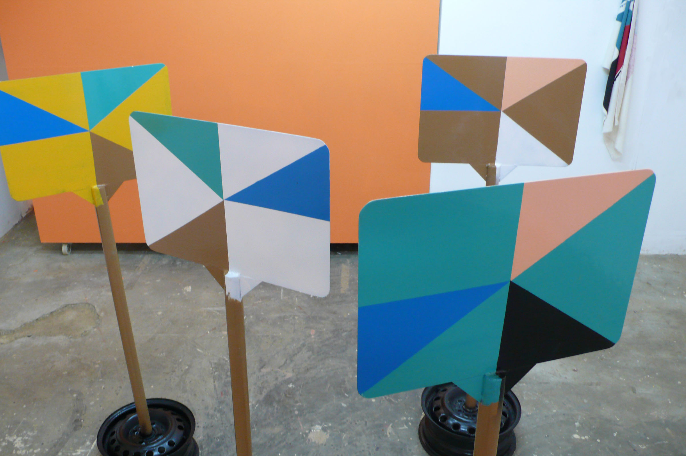 The installation is complemented by four objects – hybrid sign-paintings with wheels for their bases – which are a homage to Jaime Gili senior, who designed the majority of the wheels for the Venezuelan multinational car manufacturers in the 70s and 80s.