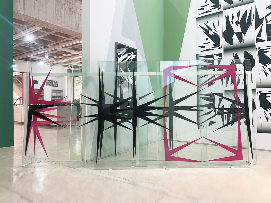 The opposite occurs with what the second axis investigates, that of integration with the architecture. Here the painting expands outside the canvas and is designed for it. Two murals in the room, expansive in themselves, and a piece composed of glass, of 2010, installed in the center of the room, illustrate this view. A capacity expansiveness that Juan Carlos Ledezma sees as a potential in each of the paintings of gili. A conversation with Max Pedemonte reveals the importance for Gili had the last opportunity in which in Caracas a successful effort was made to continue with the integration of arts and architecture, for the Caracas Metro, in the eighties of the last century.